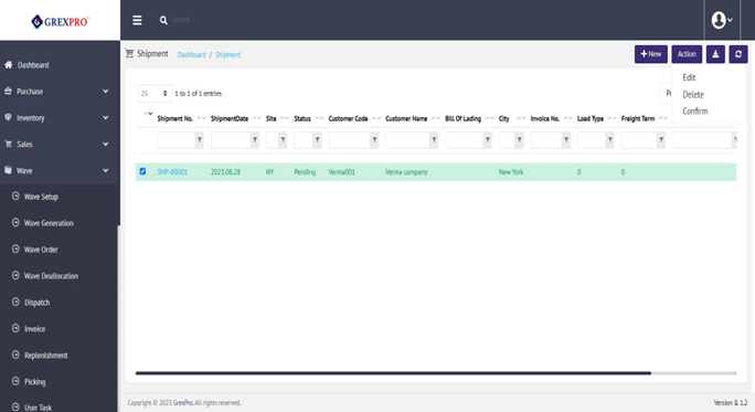 To edit a Shipment, either you can directly click the Shipment no. or you can select the entry, followed by clicking the Action button on the top-right corner of the screen and selecting 'Edit' from the list.