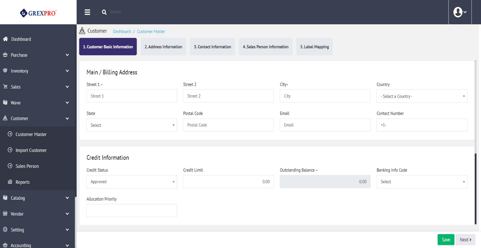 You can also add a new customer using the 'New' button located at the top right corner of the screen. The process of adding a customer is divided into four steps. After clicking the 'New' button, you will land on the following page, where you need to provide Basic Information, Business Information, and Address about the customer. Before moving to the next step using the 'Next' button, you need to save the information by clicking the 'Save' button.