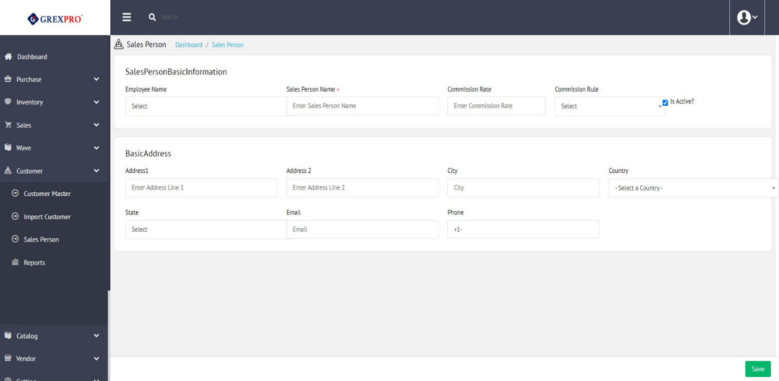 The form has basic fields including name, address, commission rule, email, phone, etc. However, a Salesperson Name is mandatory. You can also make an employee a salesperson by selecting the employee's name from the dropdown.