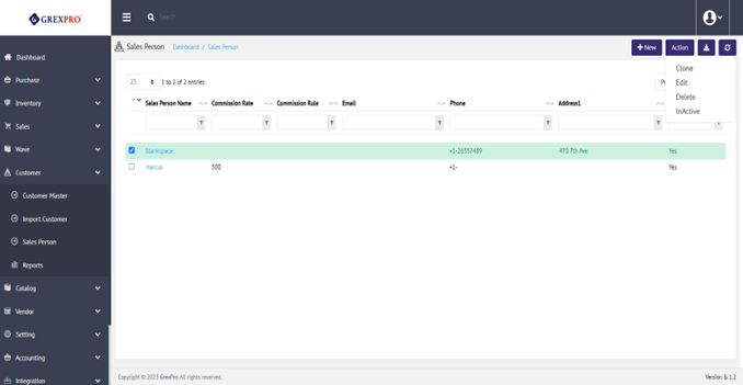 To clone the salesperson, you need to select an entry and click the 'Action' button located at the top right corner of the screen, where you will get an option of Clone. Clicking the Clone will open the form with existing details except the Salesperson Name. You need to fill in the required fields and click the 'Save' button.