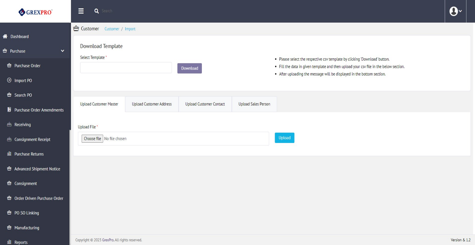 Import Customer is a feature by which a user can import Customer data into the Grexpro system from data saved into a CSV format file.